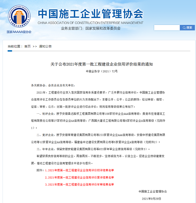 近日,在中國施工企業(yè)管理協(xié)會召開的2021年度工程建設誠信企業(yè)推介大會上,公司再次獲得 “2021年度工程建設AAA信用等級企業(yè)”和“2021年工程信用7星級企業(yè)”等共二項榮譽,這也是“十四五”開局之年公司全面貫徹新發(fā)展理念、構(gòu)建信用新發(fā)展格局在行業(yè)信用體系建設方面取得的突出成效。2021年,公司不斷完善信用體系,強化信用導向,企業(yè)管理水平和社會信譽度不斷提升。今后公司將以此為契機,不斷總結(jié)經(jīng)驗,補齊發(fā)展短板,助力企業(yè)高質(zhì)量發(fā)展。