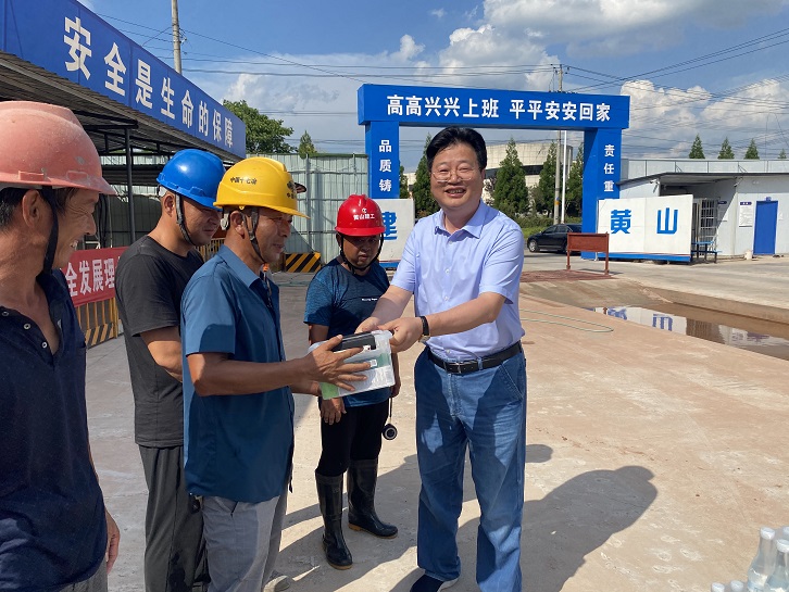 在黃山市南部城鎮群水務調度中心項目、黃山生豬定點屠宰加工及配套設施項目及配套冷鏈項目施工現場,城投集團總裁黃世穩、黨委副書記汪蓉、副總裁朱愛民等一行將慰問品送到一線職工手中,并和大家親切交談,細致了解大家的生活工作情況,總裁黃世穩叮囑要注意勞逸結合,合理安排作息時間,做好防暑降溫工作,確保實現安全生產。