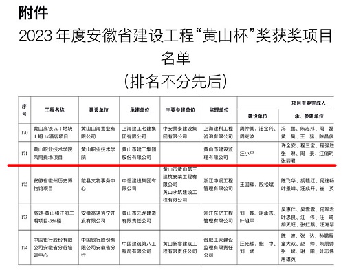 7月25日,省住建廳公布2023年度安徽省建設工程“黃山杯”獎獲獎項目名單,黃山建工承建的黃山職業技術學院風雨操場項目工程位列榜單、喜獲殊榮。