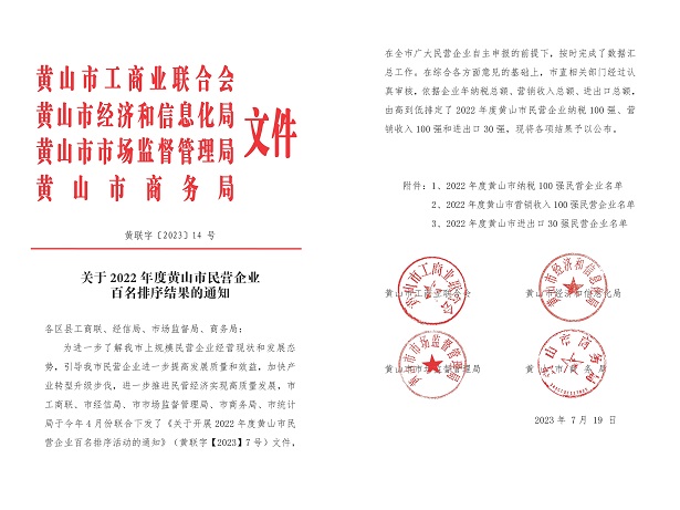 日前,由黃山市工商聯、市經信局、市監管局及市商務局聯合發布2022年度黃山市民營企業納稅及營銷收入百強名單公布,黃山建工集團連續多年再次實力入圍,獲此殊榮!