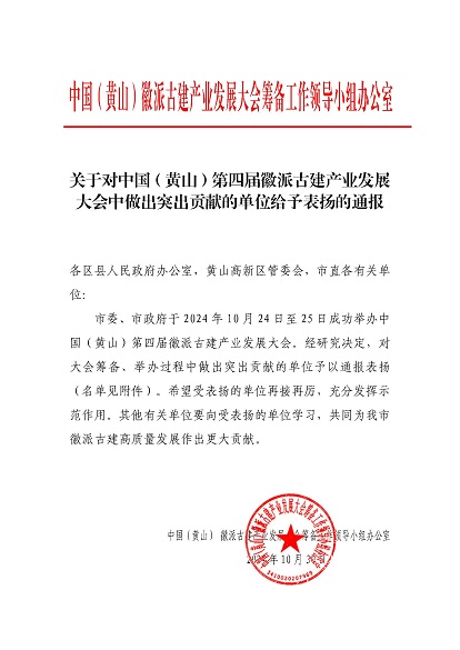 市委、市政府于2024年10月24日至25日成功舉辦中國(黃山)第四屆徽派古建產業發展大會。近日,中國(黃山)徽派古建產業發展大會籌備工作領導小組辦公室發布《關于對中國(黃山)第四屆徽派古建產業發展大會中做出突出貢獻的單位給予表揚的通報》,黃山建工集團榮列其中。