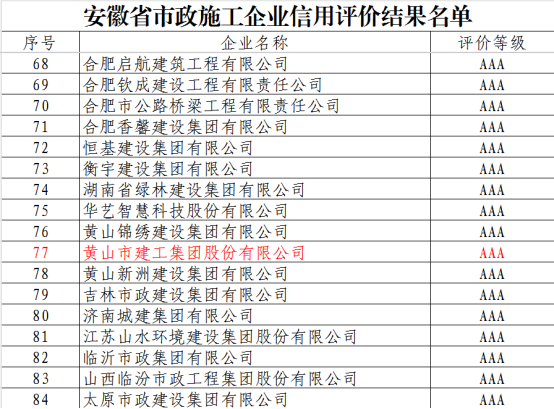 近日,安徽省市政工程協會正式發布《關于公布2025年安徽省市政施工企業信用評價結果的通知》。黃山市建工集團憑借卓越的綜合實力、規范的市場行為、優良的工程品質及堅實的信用體系建設,成功獲評最高信用等級——AAA級。標志著集團在誠信經營、履約能力與社會責任履行方面獲得了行業主管部門與協會的高度認可,是企業信用建設領域的又一重要里程碑。